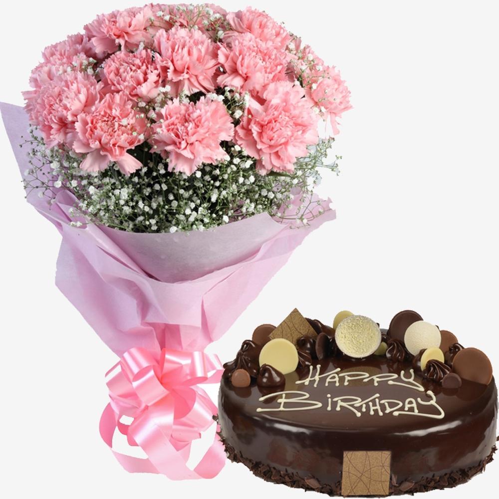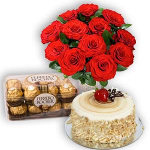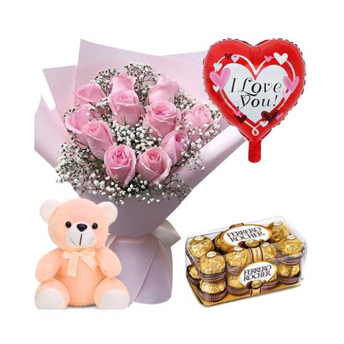 12 Pink Roses, 16 pcs Ferrero Rocher Chocolate Box with FREE Balloon